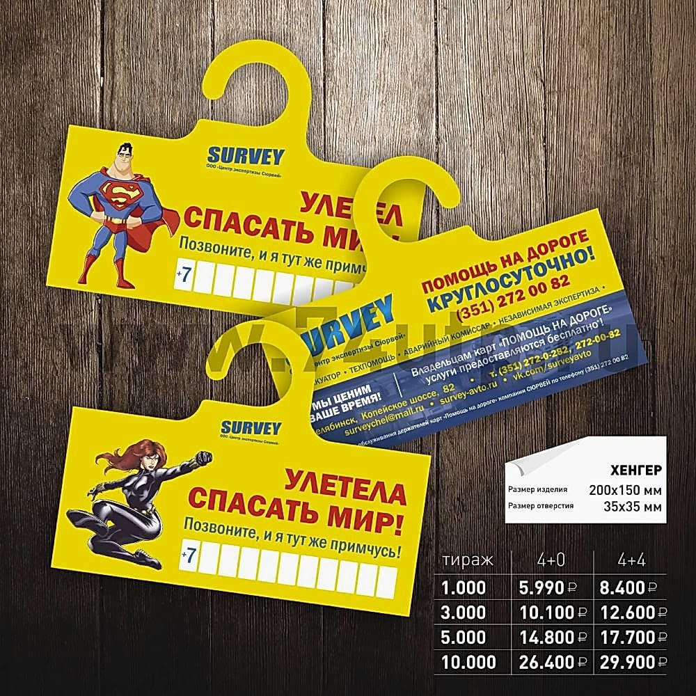 Дорхолдер (дорхенгер) - это карточный крючок на мелованной бумаге с рекламной информацией, которая вешается на ручке двери, автомобиля, мебели или Пинап другого товара. Он представляет собой яркую, привлекающую к себе внимание потенциальных клиентов, красочную листовку. На дорхенгере имеется небольшое, аккуратное отверстие для дверной ручки.