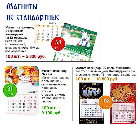 Традиционно календари магниты печатаются размером с карманный календарь, но Вы всегда можете заказать любой размер на Ваше усмотрение.